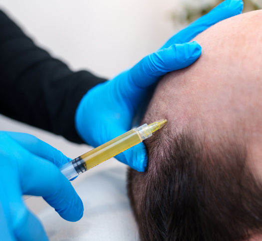 PRP: Your blood is drawn, processed and spun to isolate platelet rich plasma. PRP is injected across thinning areas to stimulate dormant follicles and improve hair density.